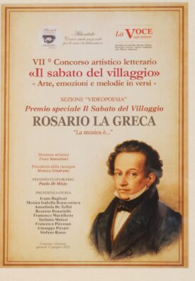 Tra i premiati nella Sezione video poesia, il poeta Rosario La Greca di Brolo (Messina), con il Premio Speciale il Sabato del Villaggio, per la videopoesia dal titolo “La musica è…”, un’opera realizzata in collaborazione con il M° Giuseppe Faranda, per la parte musicale e Francesco Destro come voce narrante.