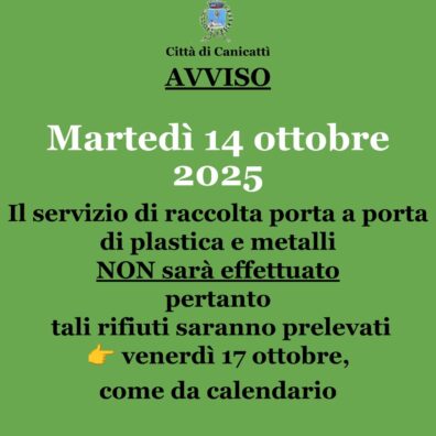 – Il Comune di Canicattì informa la cittadinanza che il servizio di raccolta porta a porta di plastica e metalli previsto per martedì 14 ottobre 2025 non sarà effettuato.