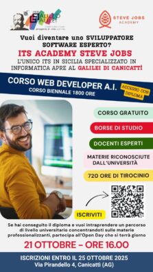 L’innovazione digitale sbarca a Canicattì con un’importante novità per i giovani diplomati: all’Istituto “Galilei” nasce il corso biennale per Web Developer A.I. – Sviluppatore Software, promosso dall’ITS Academy Steve Jobs, l’unico ITS in Sicilia specializzato in Informatica.