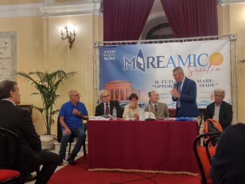 nell’atrio “Pippo Montalbano” del Teatro Pirandello, la XXXIV Rassegna del Mare, storica iniziativa di Mareamico che da oltre trent’anni promuove il Mediterraneo come spazio di cultura, economia e sostenibilità. L’edizione 2025, dal titolo “Il futuro del mare: opportunità e sfide”, proseguirà fino a domenica 26 ottobre tra Agrigento e Trapani con incontri, dibattiti e attività didattiche.