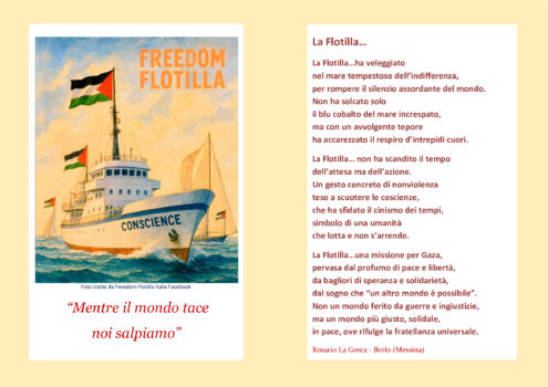 L’iniziativa Global Sumud Flotilla è la più ampia missione navale non violenta, mai tentata a sostegno dei palestinesi, coordinata da una rete globale di movimenti e associazioni. La flotta, composta da decine di piccole e medie barche a vela e partecipanti provenienti da 44 paesi, è partita da diversi porti del Mediterraneo, diretta a Gaza, con a bordo civili disarmati, composta da medici, infermieri, giornalisti, parlamentari e attivisti, in missione pacifica e solidale, in viaggio per tentare di portare aiuti umanitari, rompere il blocco navale ed entrare nelle acque territoriali della Striscia di Gaza. La Global Sumud Flotilla è stata fermata in acque internazionali da Israele, la missione è stata bloccata, ma è arrivata in tutto il mondo la luce dei riflettori sulla Palestina e ha portato con sé un’enorme flotta di terra che si è riversata nelle piazze, risvegliando le coscienze sul senso della dignità e dei diritti. Un’esperienza rivoluzionaria che un giorno verrà studiata nei libri di storia. Proprio in questi giorni, il poeta Rosario La Greca di Brolo (Messina) ha composto la poesia “La Flotilla”, ha il piacere di condividerla con tutti.
