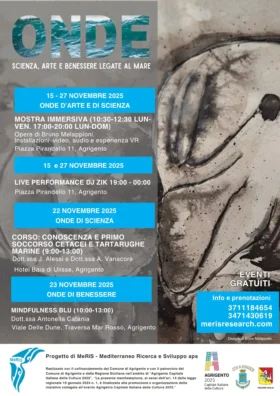 Dal 15 al 27 novembre 2025, la città di Agrigento ospita ONDE – Scienza, arte e benessere legate al mare, un progetto promosso dall’associazione MeRiS – Mediterraneo Ricerca e Sviluppo APS, risultato secondo classificato su venti proposte vincitrici del Bando “Agrigento Capitale Italiana della Cultura 2025”, con il sostegno del Comune di Agrigento e della Regione Siciliana.