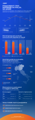 Tra i comparti produttivi, la ristorazione mostra una maggiore sofferenza nei pagamenti: il 7,3% delle imprese paga con oltre tre mesi di ritardo, seguita da costruzioni (5,9%), servizi alla persona (5,8% in crescita dell’1,4% rispetto al Q3 2024), grande distribuzione/distribuzione organizzata (5,5%). L’incidenza dei grandi ritardi è più bassa invece nelle industrie siderurgiche (2,1%), nelle Industrie chimiche (1,9%) e nelle industrie della gomma (1,9%). Se da un lato i dati dimostrano la capacità del sistema imprenditoriale italiano di onorare le scadenze con una certa regolarità, dall’altro la lieve flessione dei pagatori puntuali è un segnale che deve destare cautela: in un contesto macroeconomico ancora incerto e segnato da instabilità geopolitica e tensioni sui dazi, la tenuta della liquidità resta una priorità strategica e un aspetto da monitorare. Un monitoraggio che deve riguardare le intere filiere e per riuscire a tenere sotto controllo il rischio. In vista del 2026, le imprese italiane dovranno, quindi, continuare a bilanciare prudenza finanziaria e flessibilità operativa per non compromettere la liquidità in una fase di possibile rallentamento economico.