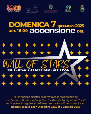 L’opera, realizzata grazie alla sinergia tra i ContemplAttivi, La Grande Famiglia, l’associazione Estia e il patrocinio gratuito del Comune di Naro, resterà accesa dal 7 dicembre 2025 al 6 gennaio 2026, accompagnando tutte le feste con un messaggio di bellezza, creatività e partecipazione.