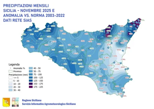 Novembre in Sicilia è stato caratterizzato da instabilità molto frequente, specie nella seconda parte del mese, con ben 22 giorni che nel mese hanno registrato precipitazioni; tuttavia la maggior parte dei fenomeni ha interessato di volta in volta solo parti limitate del territorio regionale, riuscendo solo in tre occasioni, nei giorni 7, 9 e 21, ad avere carattere più diffuso e beneficiando quasi l’intera regione.