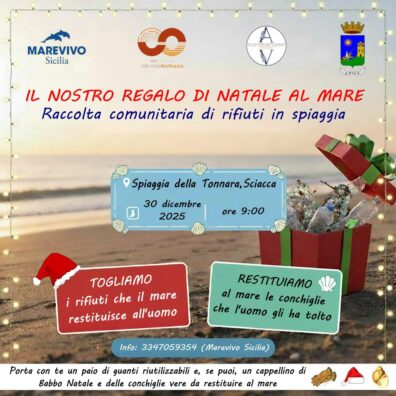 Torna l’atteso appuntamento con la “solidarietà ambientale” nel cuore delle festività natalizie. Il prossimo 30 dicembre, dalle ore 09:00 alle 12:00, la spiaggia della Tonnara di Sciacca ospiterà l’iniziativa “Il Nostro Regalo di Natale al Mare”, promossa da Marevivo Sicilia in collaborazione con la Cooperativa di Comunità “Identità e bellezza” e l’IISS Calogero Amato Vetrano.
