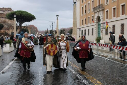 Tra questi a rappresentare la Sicilia presente anche il Gruppo Storico dei Guerrieri Ravim (Andrea Tricoli, Elodia Pitrola, Edy Tricoli, Tonino Sutera) che, dopo aver ricevuto la fascia di “Ambasciatori di Pace e Fratellanza”, hanno sfilato rigorosamente con abiti e attrezzature storico-medievali, portando con se gli emblemi del territorio come il Grifone (immaginaria creatura, stemma del gruppo ma anche del Comune di Ravanusa) e il Gorgoneion (un importante reperto archeologico del Monte Saraceno conservato come il famoso Satiro presso il Museo Archeologico “S. Lauricella”) oltre all’Antica Freccia di Pace dei Guerrieri Ravim (consegnata a Papa Leone XIV insieme ai doni dei Re Magi).