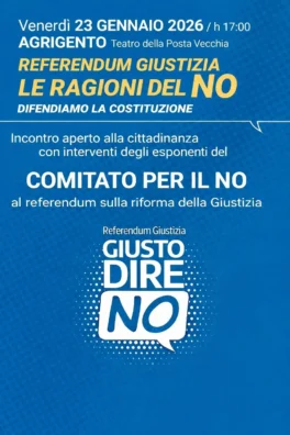Venerdì 23 gennaio 2026, alle ore 17.00, al Teatro della Posta Vecchia, si terrà l’incontro pubblico “Referendum Giustizia – Le ragioni del No. Difendiamo la Costituzione”, organizzato dal “Comitato per il No al referendum sulla riforma della Giustizia”, promosso dall’Associazione nazionale Magistrati.