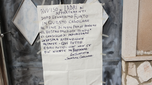 “Avviso ai ladri di appartamenti. Dopo l’ennesimo furto in questo casolare, al fine di non farvi perdere il vostro prezioso tempo, vi consiglio di indirizzare la vostra attenzione altrove. Qui tutto esaurito, cioè non c’è più niente da rapinare. Con simpatia, Salvatore Castellano”.