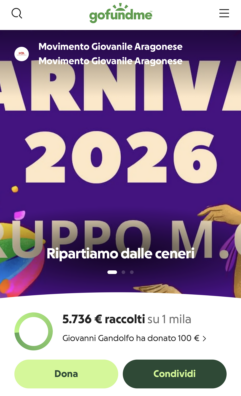 «Il carro era il frutto di tanto impegno e sacrifici – si legge nella descrizione del fundraiser –. Aiutateci a risorgere come una fenice e a portare avanti la nostra tradizione». Il Movimento Giovanile Aragonese invita tutta la cittadinanza, i sostenitori e chi ama il Carnevale a contribuire, anche con piccole somme, per garantire che le sfilate possano svolgersi come previsto.