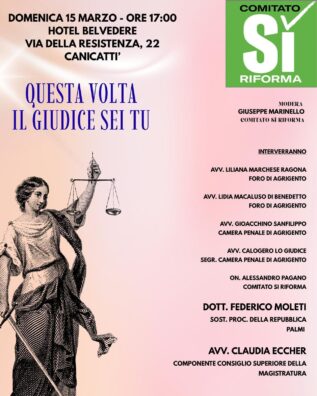 Si avvicina il momento del Referendum Costituzionale dei prossimi 22 e 23 marzo sulla riforma della giustizia. In vista dell’atteso appuntamento Canicattì si prepara ad ospitare un momento di confronto e di informazione sui temi del referendum organizzato dall’avvocato canicattinese Daniela Marchese Ragona, componente del Comitato “Sí Riforma”, che si batte per il Si. “Questa volta il giudice sei tu” è il titolo dell’incontro che si terrà domenica 15 marzo presso l’Hotel Belvedere a Canicattì, con inizio alle ore 17. A sottolineare l’importanza dell’incontro è la presenza tra i relatori del componente del Consiglio Superiore della Magistratura Claudia Eccher che sarà in cittá per esporre le ragioni del si a favore del Referendum. Oltre alla Eccher relatori saranno Federico Moletti , Sostituto Procuratore della Repubblica di Palmi, Alessandro Pagano e gli avvocati Daniela Marchese Ragona, Calogero Lo Giudice, segretario della Camera Penale di Agrigento, Lidia Macaluso Di Benedetto e Gioacchino Sanfilippo