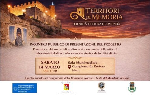 Un viaggio nella memoria e nell’identità della città. Sabato 14 marzo alle ore 17.30, presso la Sala Multimediale del complesso dell’ex Pretura di Naro, si terrà l’incontro pubblico di presentazione del progetto “Territori di Memoria – Naro”.