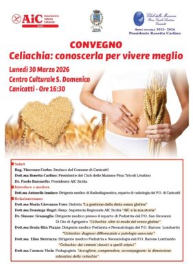 Il Club delle Mamme “Pina Tricoli Livatino“ organizza per giorno 30 Marzo una giornata dedicata alla Celiachia . Una giornata di confronto, ascolto e condivisione pensata per sensibilizzare ed informare famiglie e comunità. Considerata l’importanza dell’argomento sono stati previsti due momenti distinti da destinare ad un pubblico differente. Nella mattinata di giorno 30 marzo alla presenza dei rappresentanti regionali dell’ AIC Associazione Italiana Celiachia e di altre figure specializzate, il Club delle Mamme incontrerà presso il Teatro Sociale di Canicattì i bambini ed i ragazzi della Scuole Primaria e Secondaria di 1 grado . L’ incontro dal titolo “ Come te, ma senza glutine “ si pone l ‘ obiettivo di dare agli studenti informazioni sulla celiachia , ponendo l’attenzione sul valore dell’ inclusione.