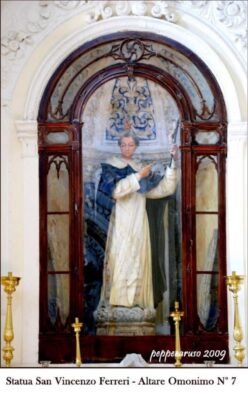 Pochi, però, sanno che a San Domenico le statue di San Vincenzo Ferreri erano – fino a qualche anno fa – due: quella più pesante rimaneva sempre nella nicchia dell’altare a lui dedicato; la seconda, più leggera, era custodita nella sagrestia da dove usciva soltanto una volta all’anno – appunto la terza domenica di settembre – per essere condotta in processione.