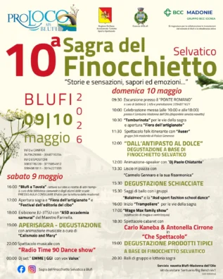 Ad aprire l’evento, alle ore 16 del prossimo 9 maggio presso l’aula consiliare del Comune, “Blufi a tavola”, letture sul cibo e ricette di altri tempi- a cura della biblioteca comunale e degli alunni delle scuole. Poi, alle 17, l’inaugurazione ufficiale della sagra con annesse la “Fiera dell’artigianato ” e il “Festival dell’editoria del cibo”. Spazio, come sempre anche all’intrattenimento e agli spettacoli: alle ore 18 esibizione di Ju-Jitsu con Asd Accademia Samurai del Maestro Farinella; alle ore 19 ‘APERISAGRA’ con animazione musicale a cura di ‘Calismaio and Mary’ e degustazione di prodotti al finocchietto; infine alle ore 22 lo spettacolo musicale- “Radio Time 90 Dance show”, e dalla mezzanotte Dj set EMME|GGI con Valux.